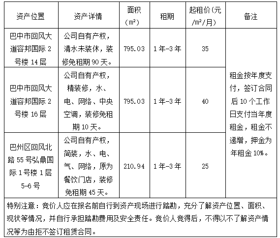 根據(jù)國(guó)有資產(chǎn)管理相關(guān)規(guī)定,巴中自然資源投資集團(tuán)有限公司決定對(duì)相關(guān)資產(chǎn)進(jìn)行公開(kāi)招租。現(xiàn)將有關(guān)事項(xiàng)公告如下:
